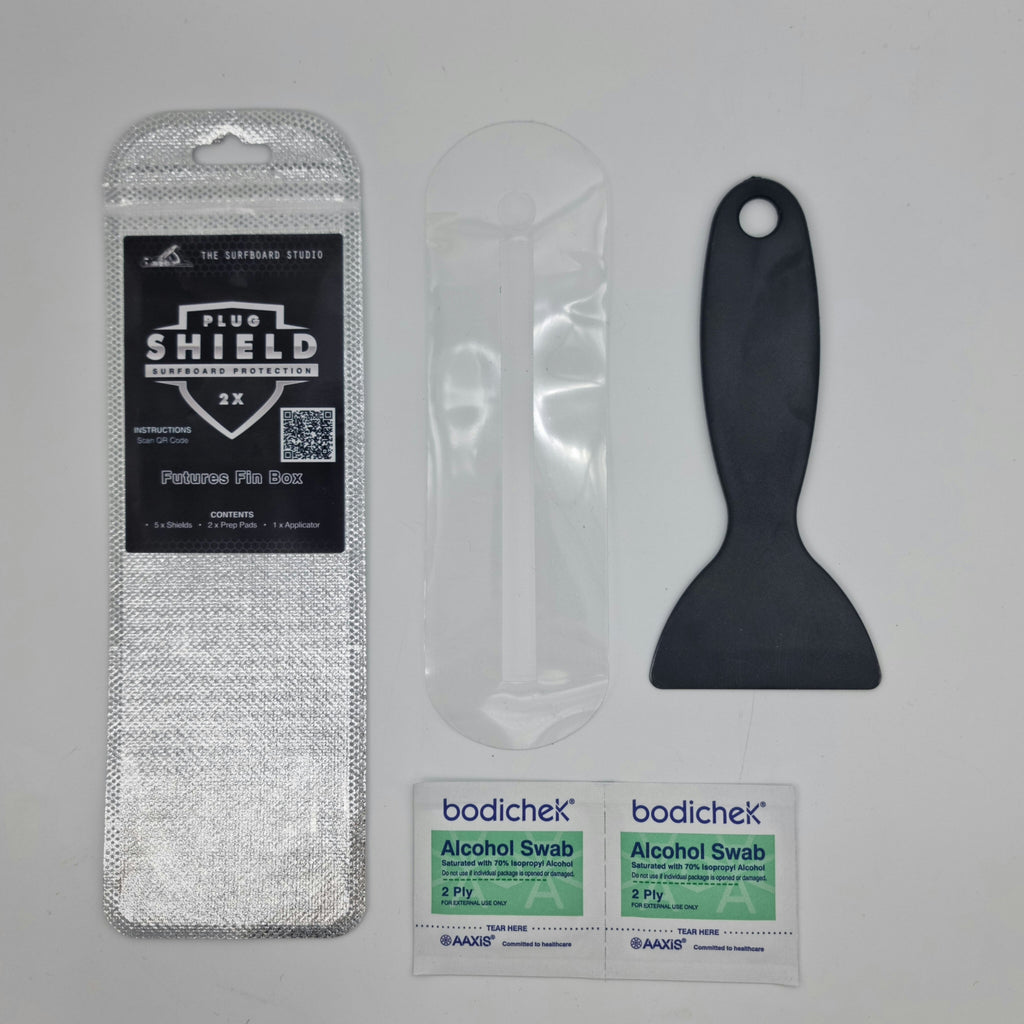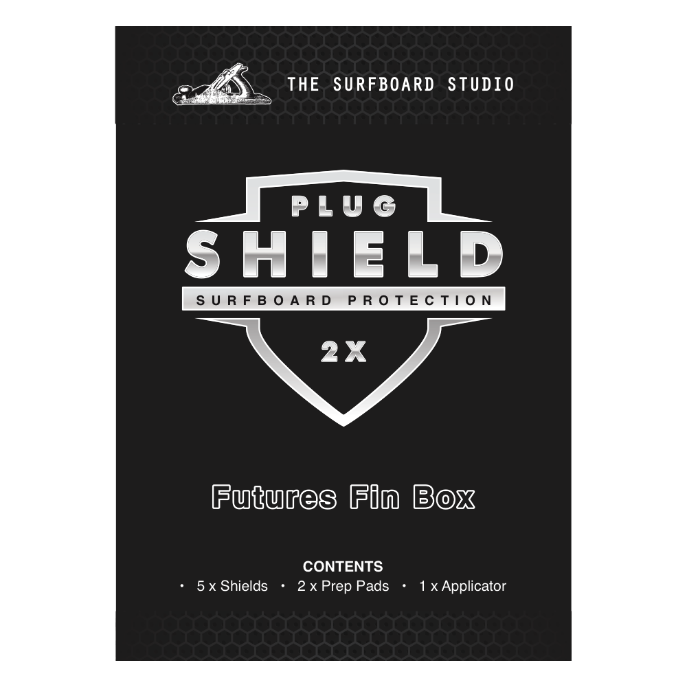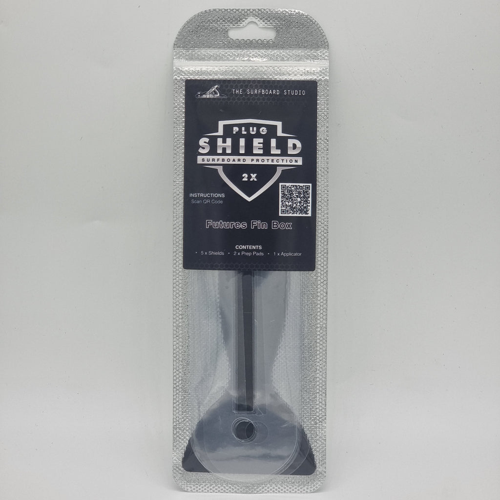 The Plug Shield for Futures fin boxes is designed to add strength and durability at the crucial point of construction where the fin box is laminated to the fibreglass.  The PVC vinyl film material laps over the fin box and fibreglass to re-enforce the area directly surrounding the fin box.  Apply to your board in under 10 minutes. The PVC vinyl film is 100% waterproof and UV resistant. Plug Shield can be replaced as required.