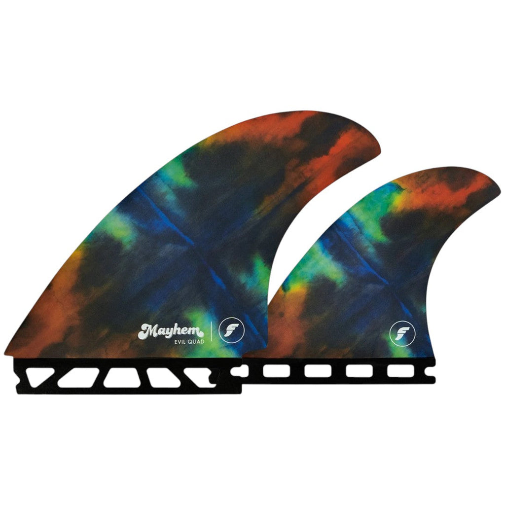 Over the last year or so, I revisited this concept and have been personally having a blast, working with Futures to get it tested and developed. Using the new "medium sized" Evil Twin template up front and pairing with two 80/20 foiled, downsized rear quads, we felt we nailed it. After playing with varying cants, flexes, and visuals, we are proud to announce and release the all NEW EVIL TWIN+2…or should we say EVIL QUAD." Mayhem